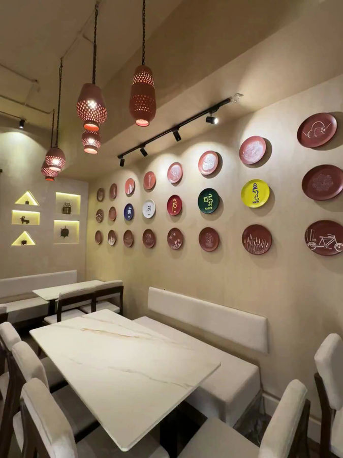 At the heart of our culinary passion lies our inaugural venture, a meticulously curated North Indian restaurant where every element resonates with our personal touch. As you step through the entrance, you're greeted by a spectacle of hanging lights crafted from handpicked pots, each delicately perforated to emit a warm glow. Inside, the ambiance is a symphony of curated details—hand-painted plates adorning one wall, narrating tales of the North; antique artifacts nestled within niches, evoking nostalgia; aesthetically placed cots against another wall, and an old arched window offering a glimpse into tradition. The loft, reminiscent of homes in Manali, serves as an intimate dining enclave, complete with lower seating and rustic charm. A quaint terrace, reminiscent of the serene vistas of the hills, provides an elevated view of the restaurant, complemented by a cozy seating arrangement and a Haryanvi hookah, adding a touch of authenticity. The restaurant's name, ensconced within a beautiful antique arch, stands as a testament to our dedication to creating a truly immersive dining experience, where every detail reflects our passion for hospitality and tradition.